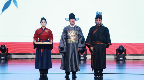 姚恩全身着传统汉服,为新生代表行“首加冠”礼;王莉莉与全体新生辅导员统一汉服装束,依次为新生集体加礼。