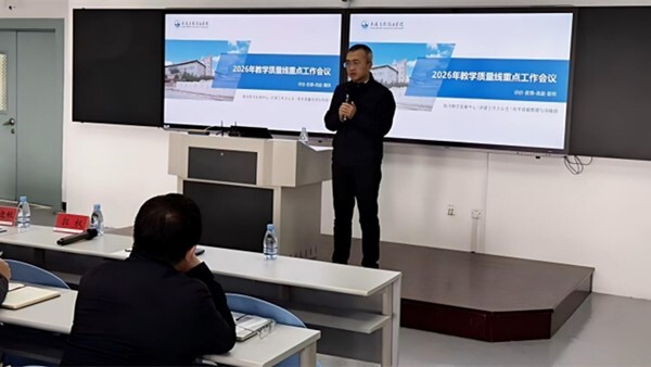 郭权在会上讲话。他明确了2026年学校“深耕年”的发展定位,锚定了学校发展目标,并就重点工作提出以下要求:一是围绕专业、课程、教师、学生四大核心要素,开展系统性深耕。