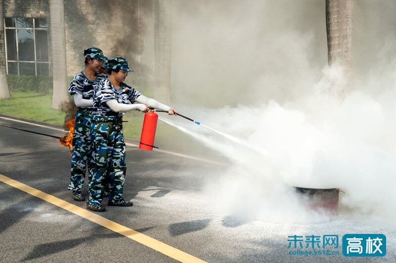 演练伊始,尖锐的警报声划破校园宁静,模拟火情的烟雾迅速在楼舍内弥漫,新生们在教官和现场保安员指引下,捂住口鼻,低姿弯腰,沿预定路线快速撤离至运动场安全区域,展现出高效的应急响应能力。在参训新生集结完毕后,大圃消防救援站教官现场点评了此次演练,并演示讲解防火面具穿戴方法,以及干粉灭火器“提、拔、握、压”四字使用技巧。随后,在现场消防员指导下,部分新生分组手持灭火器实操扑灭模拟火点,切实掌握应急技能。