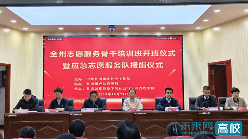 10月29日上午,甘南州全州志愿服务骨干培训班开班仪式暨应急志愿服务队授旗仪式在甘肃民族师范学院举行。甘南州人民政府副州长王芳、甘肃民族师范学院党委副书记敏贤麟,州委社会工作部部长郭路及相关部门负责人出席仪式。全州参训学员及学校社会工作专业师生参加。