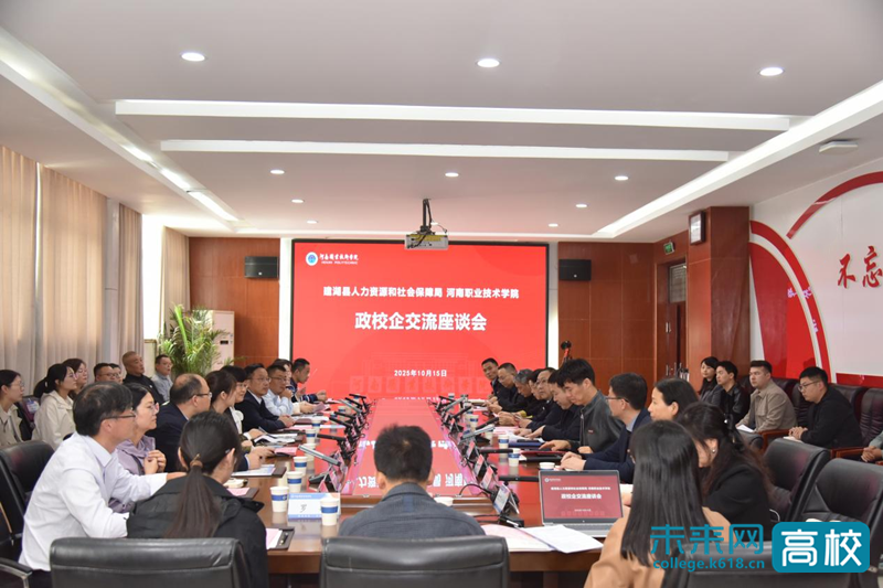 10月15日下午,江苏省建湖县人力资源和社会保障局党委书记、局长葛步中率县人社局、经济开发区、近湖街道等单位负责人及15家优质企业代表到河南职业技术学院开展校地合作交流座谈。河南职业技术学院党委委员、副校长鲁冬出席并致辞,发展规划处、教务处、材料工程学院等相关职能部门及二级学院负责人、就业专干参会。
