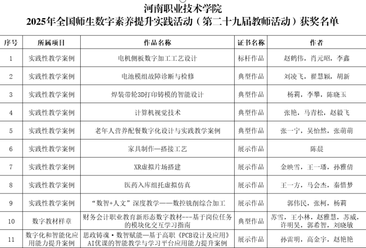 日前,教育部教育技术与资源发展中心公布了2025年全国师生数字素养提升实践活动(第二十九届教师活动)评选结果,河南职业技术学院共有11项作品脱颖而出,喜获佳绩。其中,实践性教学案例荣获标杆作品1项、典型作品4项、展示作品4项;数字教材样章获评典型作品1项;数字化和智能化应用能力提升案例入选展示作品1项。