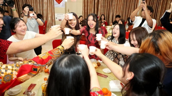 留校过年的中外师生欢聚一堂,共享“年夜饭”,喜迎“中国年”。