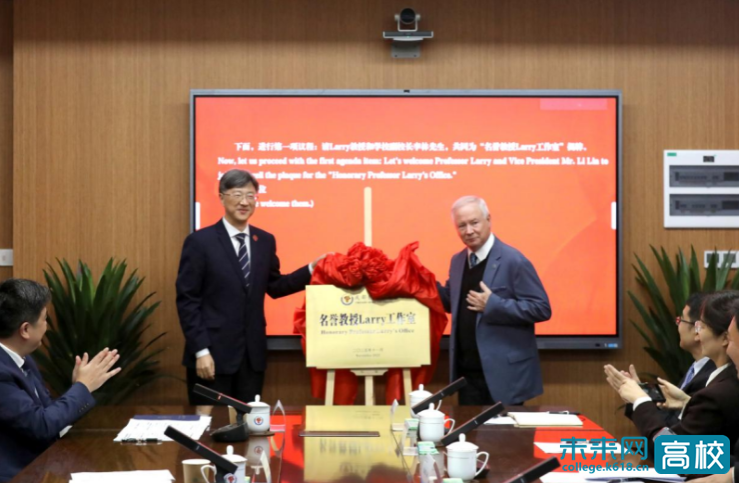 在热烈的掌声中,李林与Larry教授共同为“名誉教授Larry工作室”揭牌,标志着该工作室正式启用,未来将成为学校高层次国际学术交流与科研合作的重要平台。