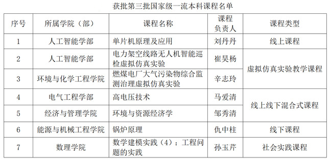 上海电力大学新增7门本科课程被认定为国家级一流课程,其中线上课程1门、线上线下混合式课程2门、线下课程1门、虚拟仿真实验教学课程2门、社会实践课程1门。