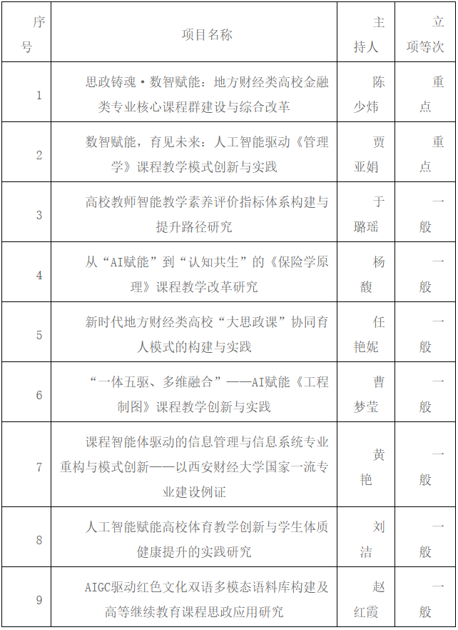 西安财经大学共有9个项目成功获批立项,其中重点项目2项,一般项目7项,充分体现了该校在教育教学改革方面的持续探索与研究积累。