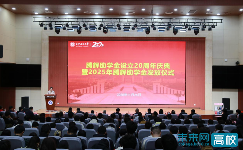 11月26日下午,西安石油大学举行腾辉助学金设立二十周年庆典暨2025年腾辉助学金发放仪式。学校党委副书记张木,腾辉助学金主要出资人、西安腾辉电气有限公司总经理、学校校友何荣,学生工作处、校友工作与合作交流处、团委、机械工程学院负责人,西安腾辉电气有限公司员工代表,往届受助优秀校友代表康琦、张凯锋、宁世洁,2025年受助学生及各院系师生代表共400余人齐聚一堂,共忆育人初心,共话成长担当,庆典由学校副校长种宇宏主持。