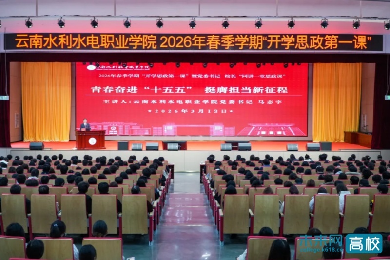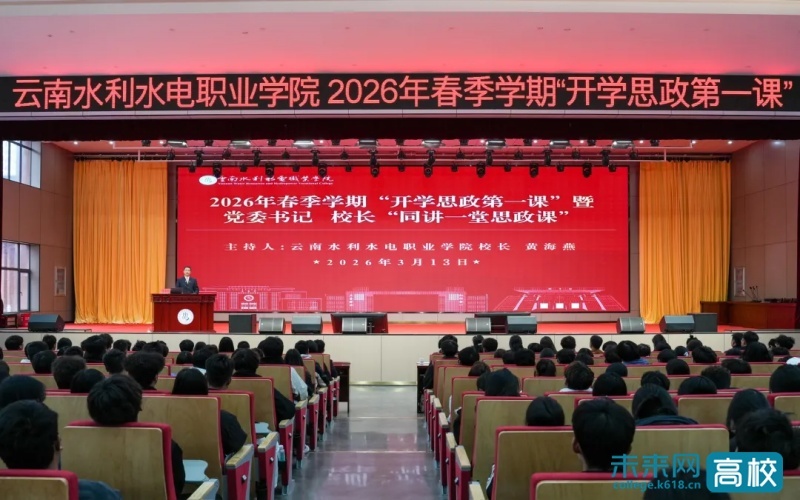 3月13日,云南水利水电职业学院举行2026年春季学期“开学思政第一课”暨书记、校长“同讲一堂思政课”。全体思政课教师、马克思主义学院党支部全体党员、各二级学院辅导员代表和学生代表在蓝龙潭校区主课堂参加学习,其余师生通过网络直播在分课堂参加学习,全校共计8000余名师生参加线上线下学习。