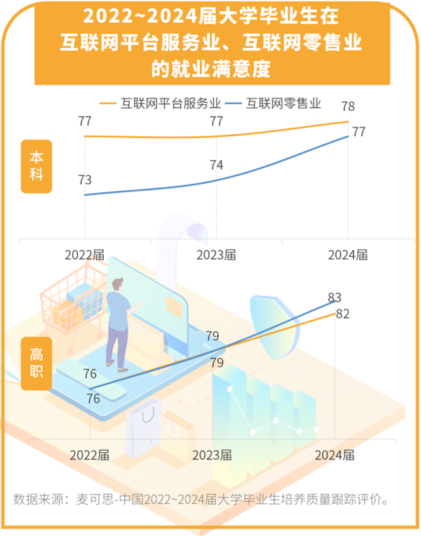从就业满意度来看,2024届本科毕业生从事互联网平台服务业、互联网零售业的就业满意度分别为78%、77%,其中在互联网零售业的本科生就业满意度近三年上升较多,较2022届的73%上升了4个百分点。