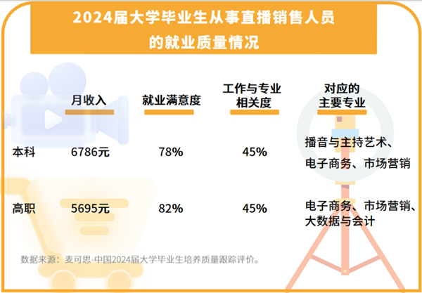 具体来看,2024届从事直播销售人员这一职业的本科生和高职生月收入分别为6786元、5695元,超过全国平均(本科平均:6199元,高职平均:4775元)较多。从事直播销售人员的本科生,主要来自播音与主持艺术、电子商务、市场营销等专业,高职生则主要来自主要电子商务、市场营销、大数据与会计等专业。整体来看,这个新职业对专业背景限制较少,本科、高职的工作与专业相关度均为45%,明显低于全国平均(本科:73%、高职:61%)。具备沟通表达、应变能力及用户洞察等素养,以及直播经验的持续积累,能帮助毕业生在岗位上快速成长、实现更好发展。