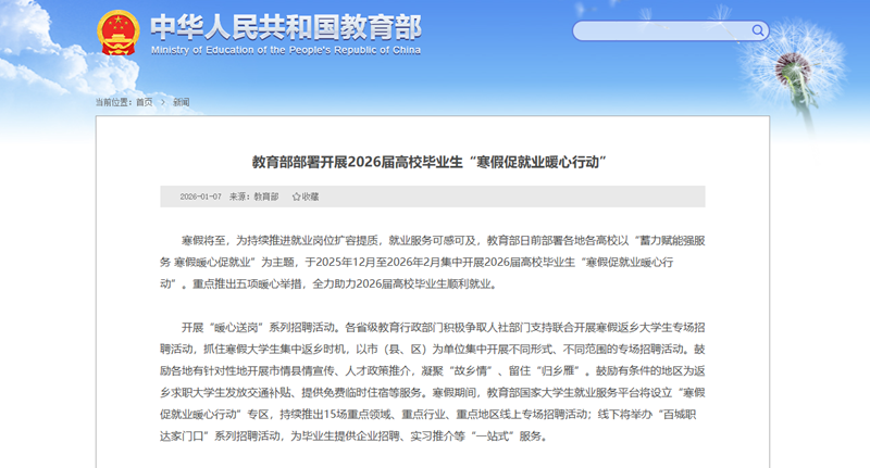 据教育部网站消息,教育部日前部署各地各高校以“蓄力赋能强服务 寒假暖心促就业”为主题,于2025年12月至2026年2月集中开展2026届高校毕业生“寒假促就业暖心行动”。重点推出五项暖心举措,全力助力2026届高校毕业生顺利就业。