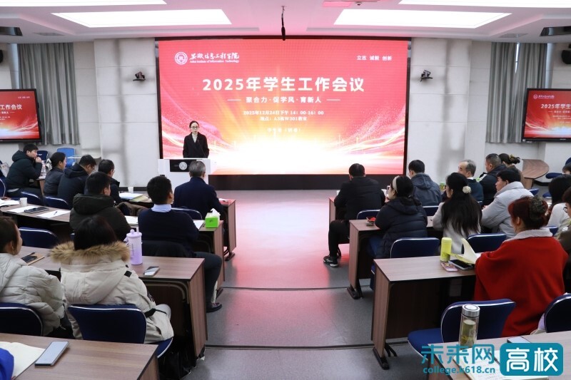 12月24日下午,安徽信息工程学院以“聚合力·促学风·育新人”为主题,召开了2025年学生工作会议。学校党委书记陈永红,副校长董方敏、章敏凤出席会议,教务处、学生处(团委)负责人,各二级学院党总支书记、副书记,全体学工秘书、辅导员及学生处(团委)全体工作人员参会。会议由学生处副处长随小莉主持。