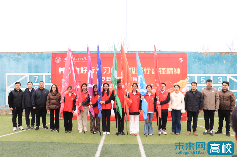 宣誓结束后,与会领导为各志愿服务团队授旗。旗帜交接,使命相传,每一面旗帜都承载着学校对志愿服务团队的殷切期望,也象征着志愿精神的接力与传承。最后,章敏凤宣布:安徽信息工程学院2026年学雷锋志愿服务月正式启动。