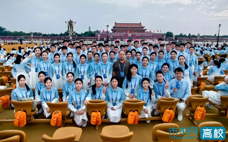 学院近百名师生参与中国人民抗日战争暨世界反法西斯战争胜利80周年纪念大会合唱方阵,演唱《没有共产党就没有新中国》等经典歌曲。