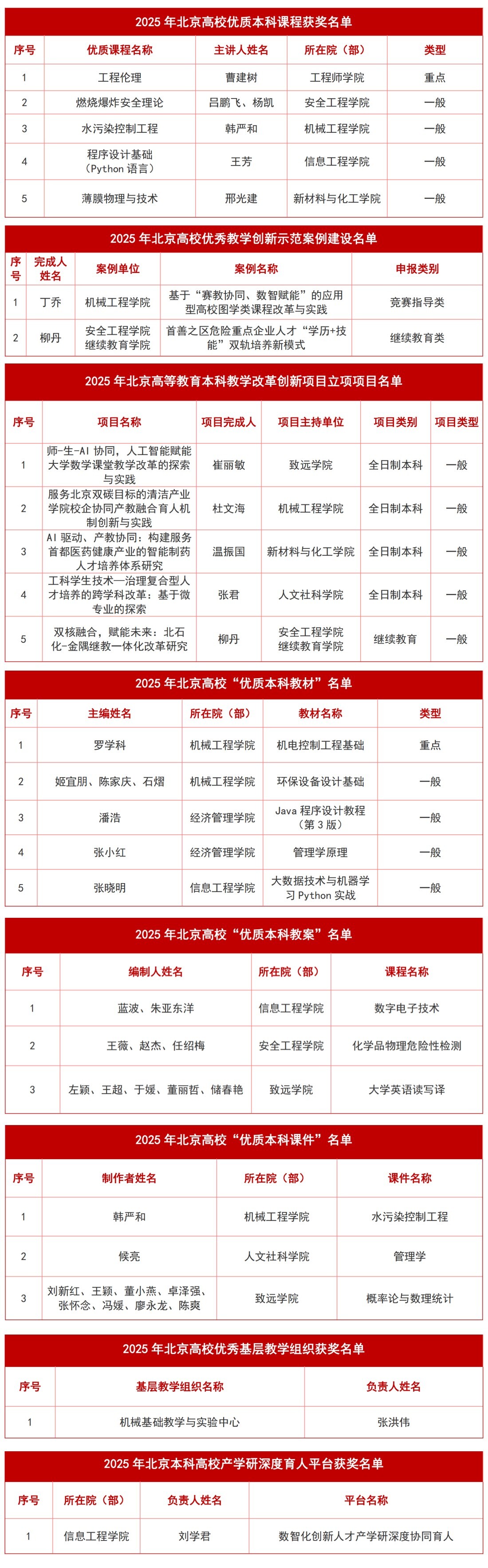 近日,北京市教育委员会公布了2025年北京高校本科教学项目建设评选结果。北京石油化工学院获评北京高校优质本科课程、优质本科基本教学资源、优秀基层教学组织、本科教学改革创新项目、优秀教学创新示范案例、产学研深度协同育人平台等6大类、25项荣誉,为学校新一年教育教学高质量发展实现开门红。