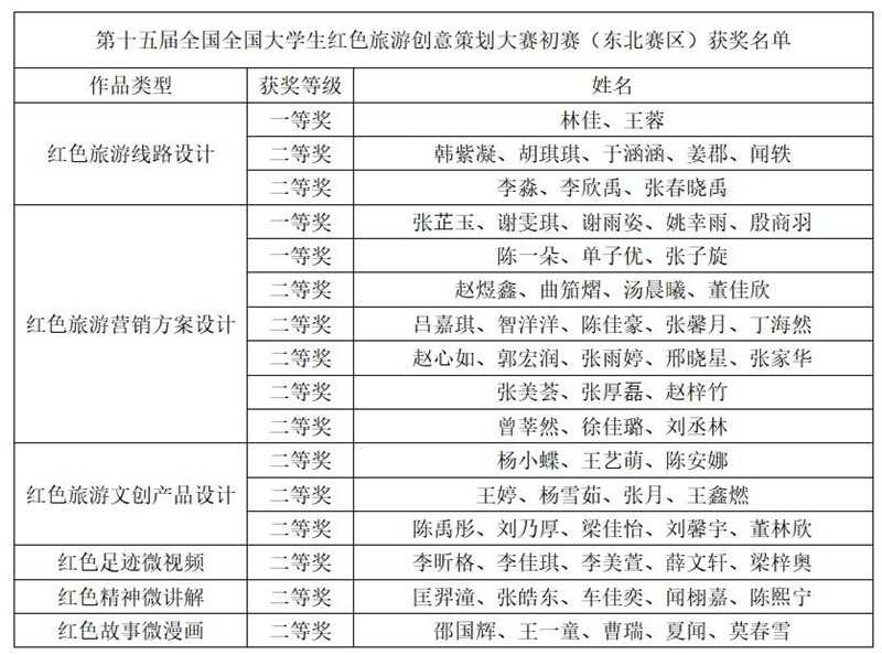 近日,由文化和旅游部资源开发司、国家发展和改革委员会社会发展司、北京第二外国语学院主办的第十五届全国大学生红色旅游创意策划大赛圆满落幕。大连财经学院学生取得了优异成绩,荣获初赛(东北赛区)一等奖3项、二等奖13项。