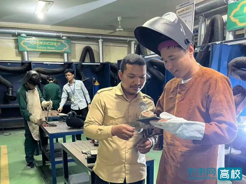 他教的是智能焊接,一个班25名学生。设备简陋、语言不通,但他硬是靠着一台翻译机、无数手势比划、反复板书演示,把焊接符号、工艺图纸、焊接参数选择——这些柬埔寨学生从未系统接触过的理论知识,一点点“焊”进了他们的认知中。