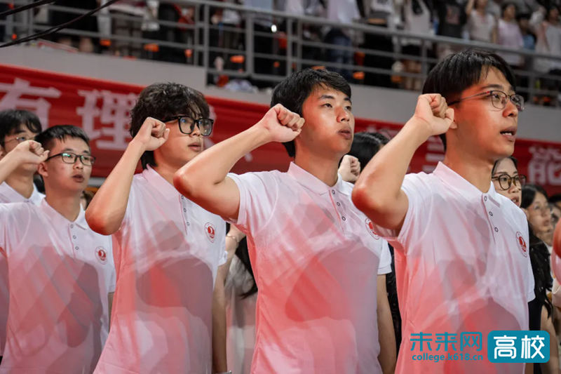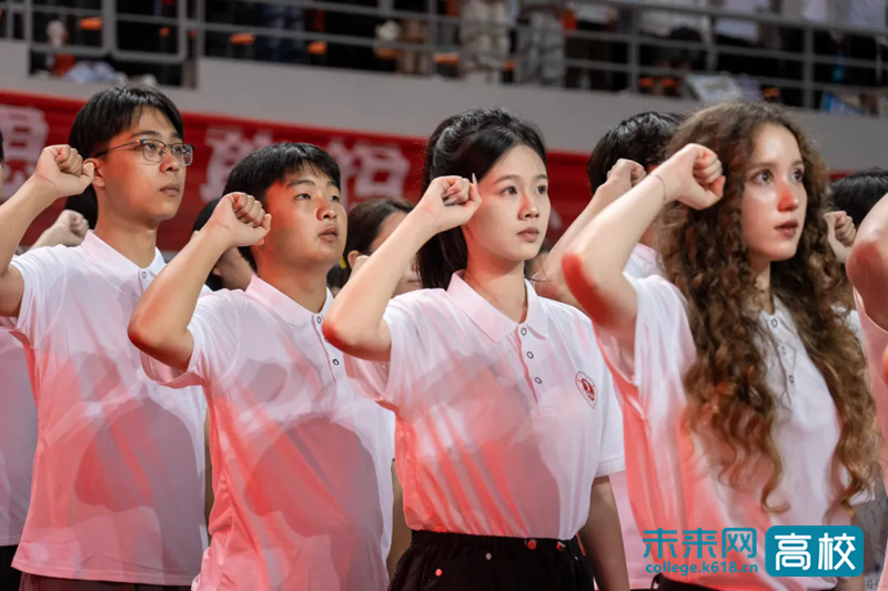 全体新生一起郑重宣誓:将努力茁壮成长为一名德智体美劳全面发展的、想得明白、说得明白、写得明白、干得明白的时代新人,为中国式现代化挺膺担当!请党放心,强国有我!新生的铮铮誓言响彻整个场馆。