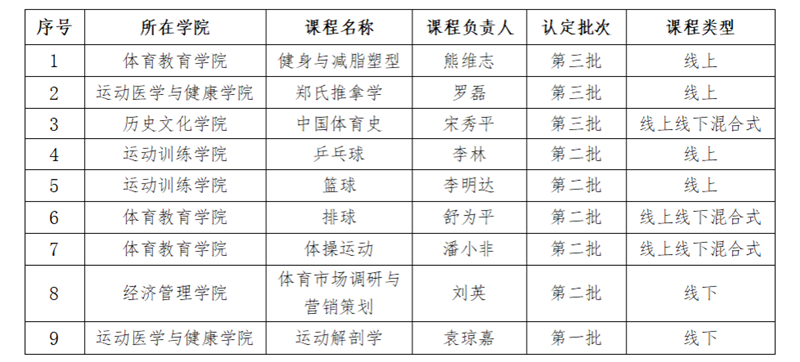 教育部自2019年启动实施“金课建设计划”以来,共开展了三批次一流本科课程建设,通过打造“金课”替代“水课”、构建高质量本科课程体系,旨在解决传统本科课程存在的教学内容滞后、教学方法单一、缺乏高阶性/创新性/挑战度等弊端,实现本科教学质量“变轨超车”、提升人才培养质量的目标。课程作为专业建设、人才培养的核心载体,一直以来,学校秉承专业-课程-教材一体化建设理念,彰显体育学学科专业优势,构建校院协同、上下联动的责任共同体,形成了“国家级-省级-校级”三级培育、分层递进的成长模式,持续提升一流课程的时代性与引领性,为培养高素质应用型人才奠定坚实基础。