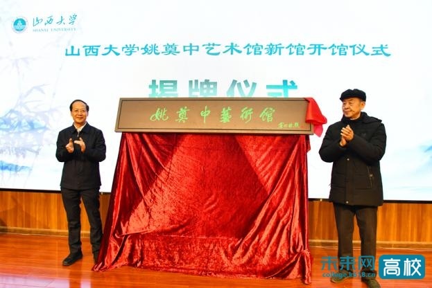 李青山和姚奠中先生家属代表姚大云共同为姚奠中艺术馆新馆揭牌。郝平代表学校向慷慨捐赠的姚奠中先生亲属及山西省姚奠中国学教育基金会颁授了捐赠证书。
