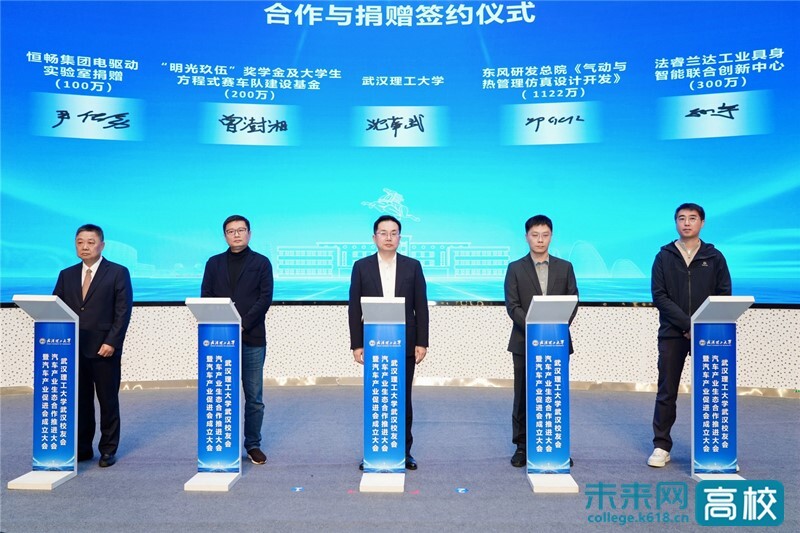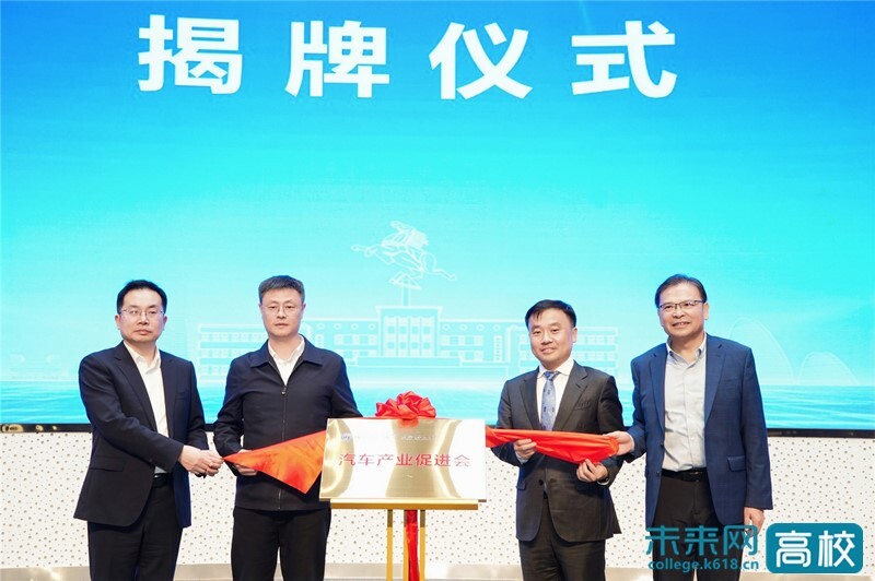 王发洲、赵永强、沈革武、李叶青共同为汽车产业促进会揭牌。沈革武代表学校与东风汽车研发总院、发睿兰达科技有限公司签订科技合作协议,与校友尹传勇、曾澍湘签订捐赠协议。