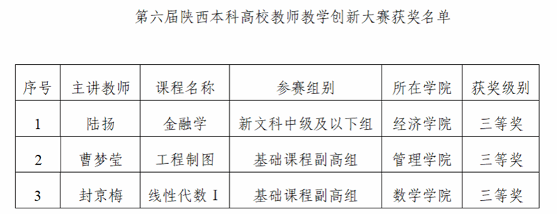 近日,由陕西省教育厅主办、西北工业大学承办的第六届陕西本科高校教师教学创新大赛落下帷幕。经过校级初赛、省级复赛和省级决赛三个阶段的层层选拔,西安财经大学经济学院陆扬教师团队、管理学院曹梦莹教师团队、数学学院封京梅教师团队荣获三等奖。